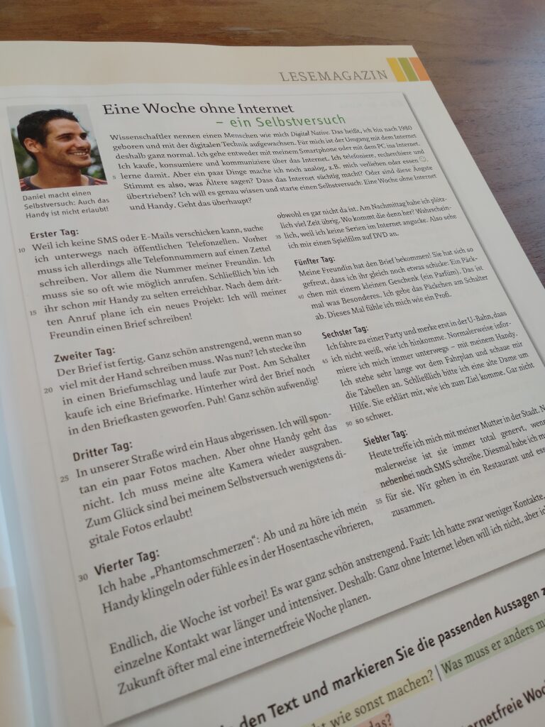 自分が現地で勉強していた頃はそんなに気にならなかったんですけど、特にこの『 Menschen A2.1 / A2.2 』は A1とのレベルの違いが目に付くな、と思うのです。とりわけ文字の分量が多い!!! 単純に1ページあたりの情報量が増えているわけなのですが、A1のユルユルな雰囲気が完全に喝破されています。文字数が増えると脳内で情報処理する量も増えるわ、1ページあたりの文字数も多いわ、慣れるまでは少し大変かもしれませんね。